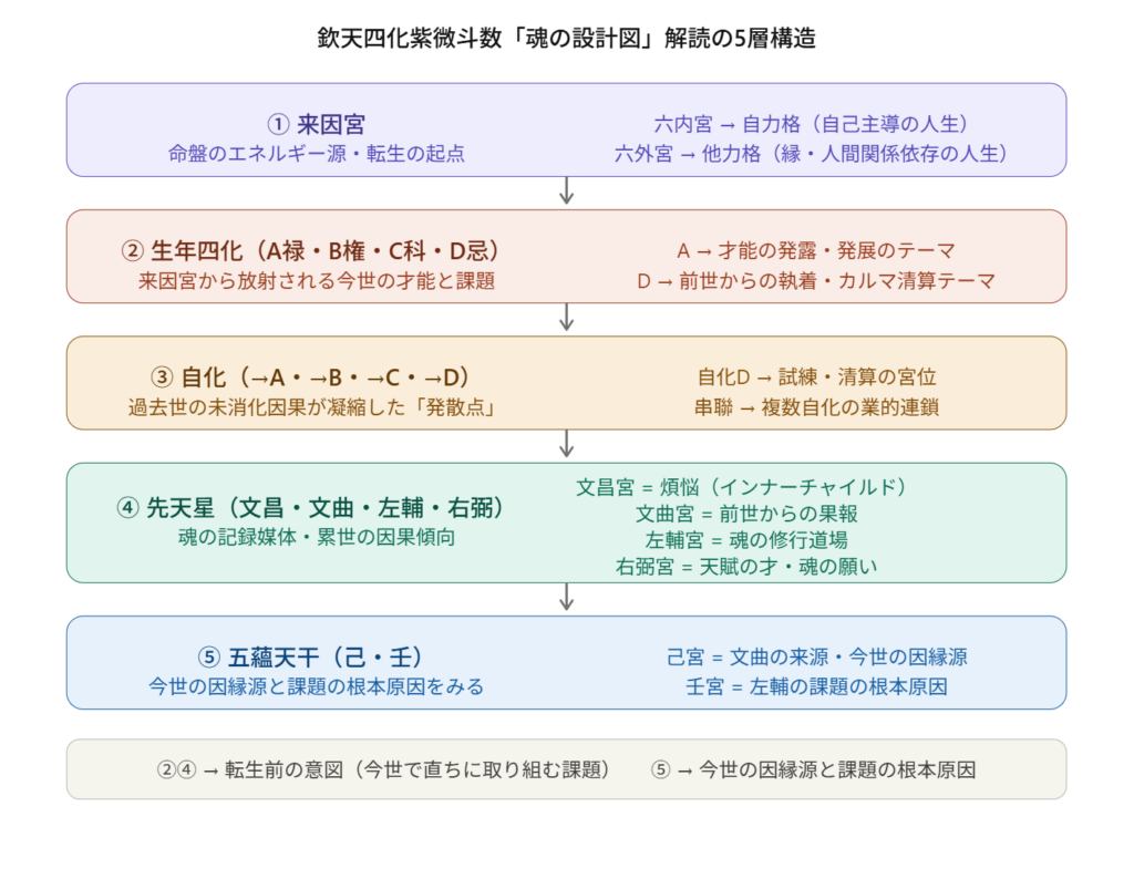 - 5層構造の全体像 — 来因宮→生年四化→自化→先天星→五蘊干という解読の階層と、各層の核心的意味