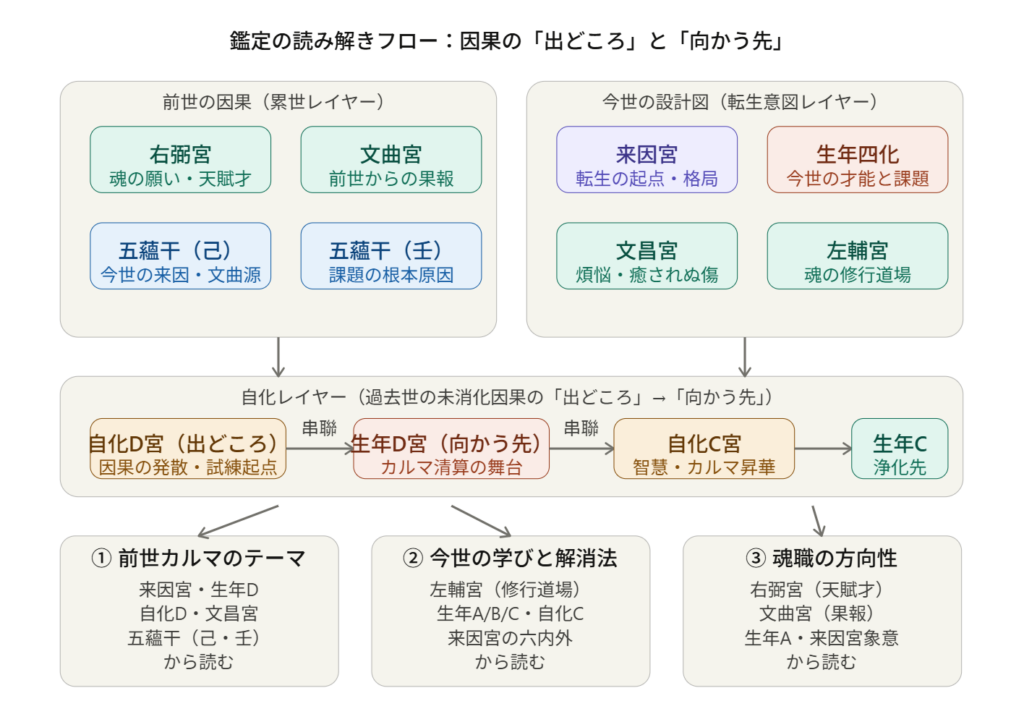 - 因果フローチャート — 前世レイヤー・今世レイヤー・自化レイヤーがどう連動し、3つの鑑定テーマ(前世カルマ・今世の学び・魂職)に接続されるか