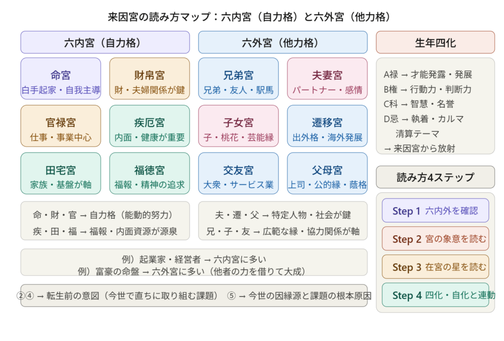 最後に、来因宮の読み方マップ:六内宮(自力格)と六外宮(他力格)を図解します。